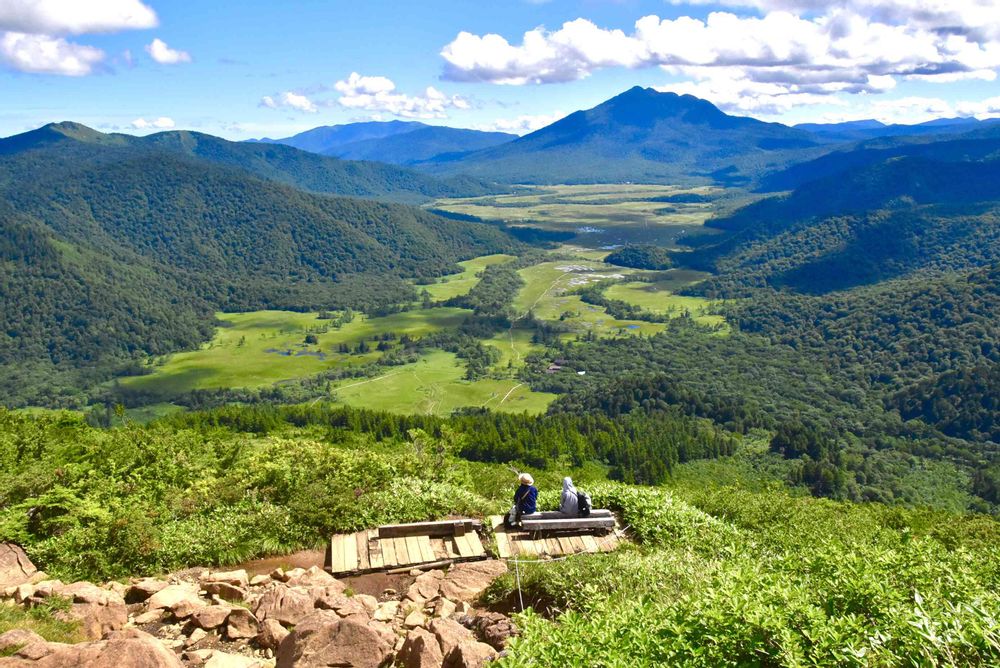 だいぶ登ってきました、もう森林限界は超えています。眼下に広がるのが尾瀬ヶ原の湿原、対面に見えるのが燧ヶ岳。