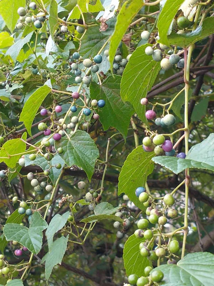 近くの水辺の木に巻き付いた、野ぶどうの花が終わって💜💙💓綺麗な色の実がついてきました