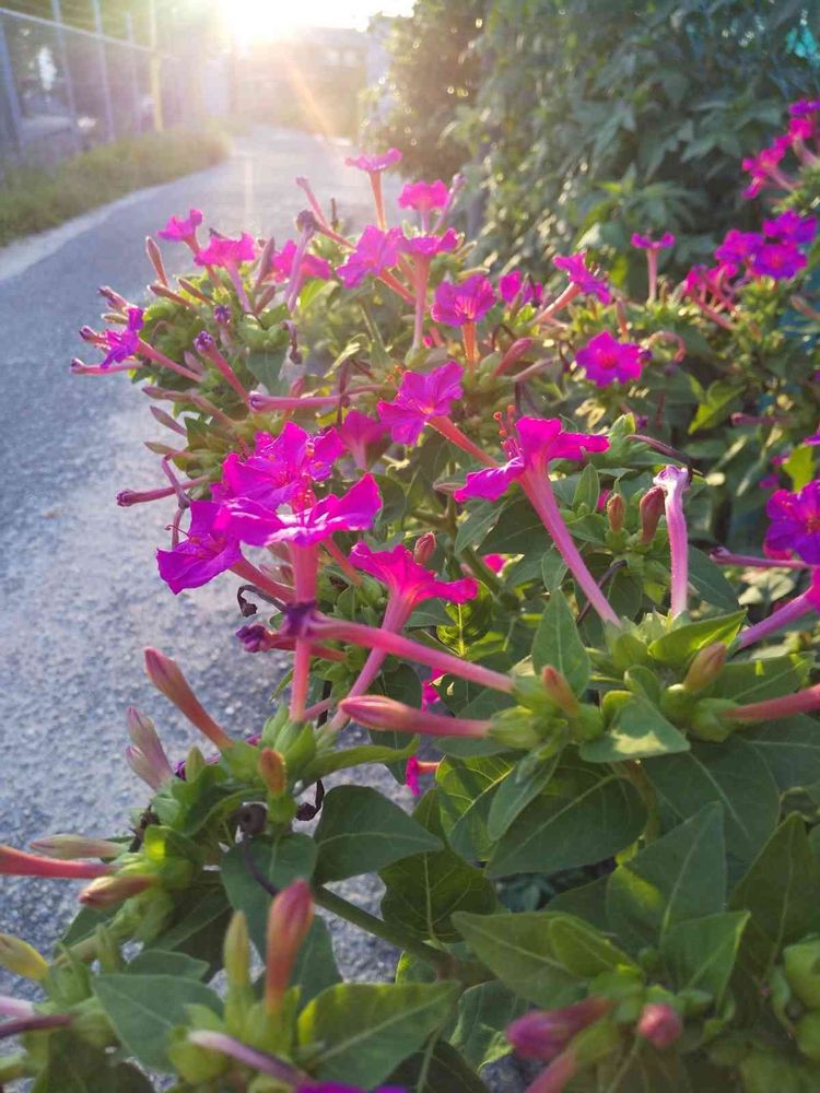 真っ赤なオシロイバナ…夕日に輝いて咲いてました…