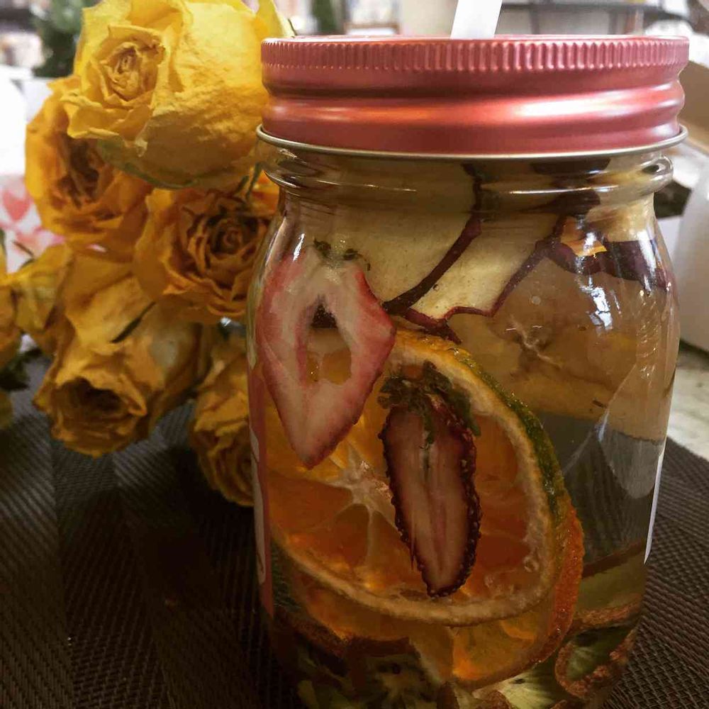 フォンダンウォターというものを知りました。早速ドライフルーツを入れた瓶に水を入れてしばらく置いて試飲。フルーツそれぞれの香りや甘味や酸味などが味わえて美味しかったです。 It is said that dry fruit in water or carbonated water is called Fondant Water. When I tried the first tasting by putting the dried fruit that I made, it tasted and smelled each fruit and it was delicious.