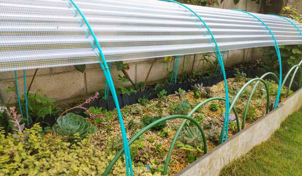 梅雨の時期にプラダンで簡易屋根を付けた多肉花壇ですが、紫外線で劣化が酷くボロボロになったので、波板に交換しました(^^;)
