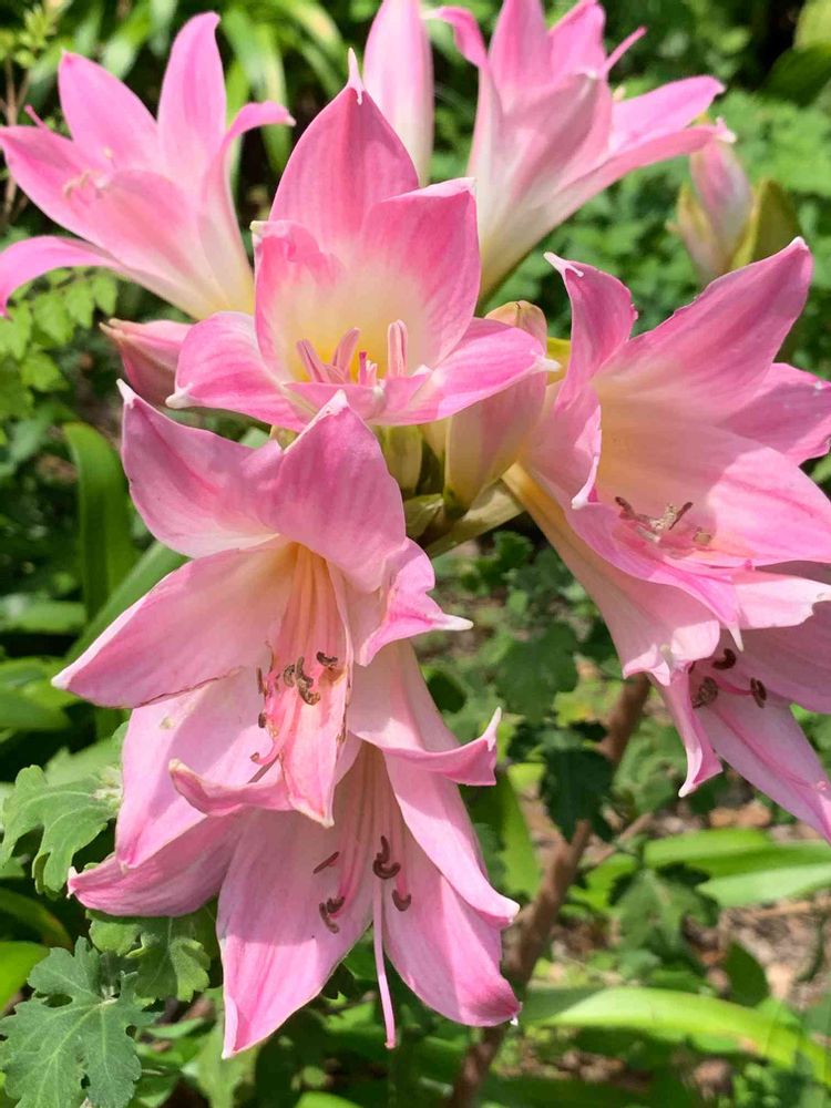 華やかなピンクに目を奪われて近づくと、ハマユウを少し小ぶりにしたような作りで、葉はアガパンサスに似ています🌿