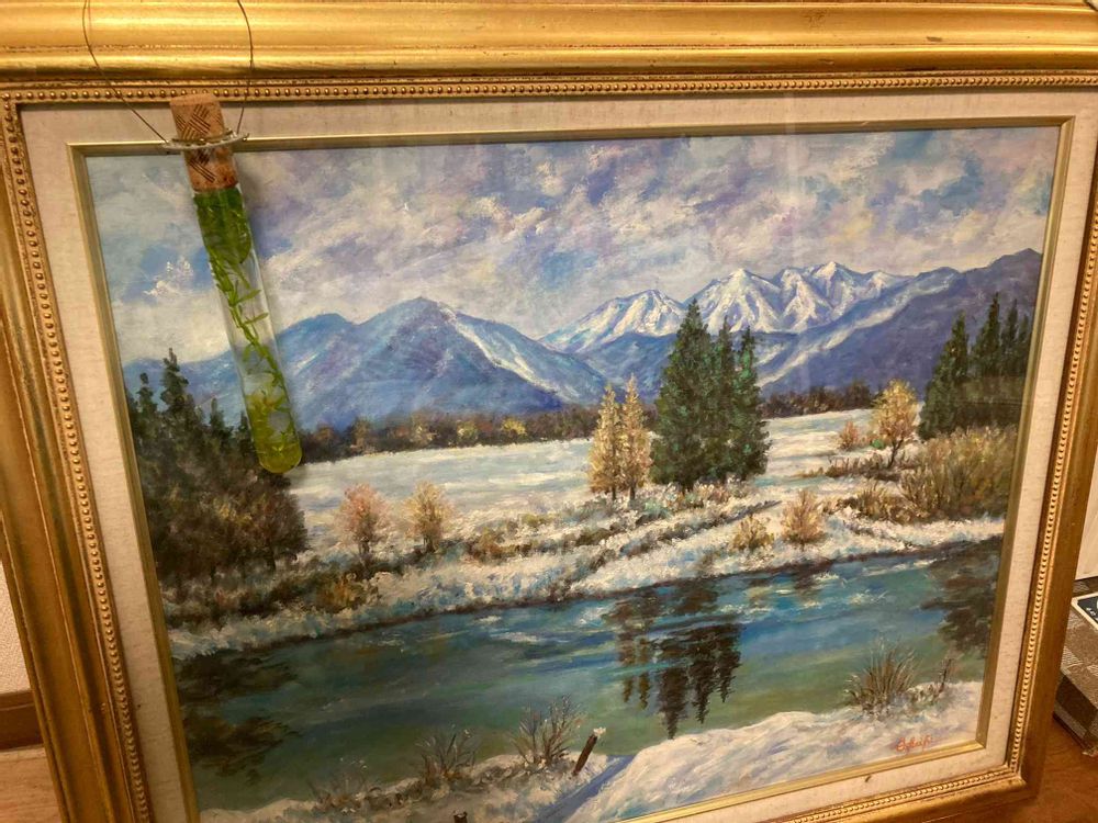 この絵はどなたの作か、売っている人も知らないそうで、フリーマーケットで見つけ、丁度持っていた現金まで負けてくれたので買って来たものです⁉️額代以下なので、本人が聞いたら怒っちゃうかも⁉️そしてもっと見せたかったのは左上に下がった試験管の中、水草を入れてみました‼️涼しそうで、素敵でしょ❣️
