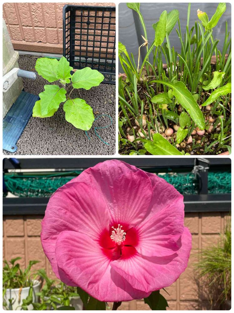 上左、長雨で人工芝からナスが育ってます😅