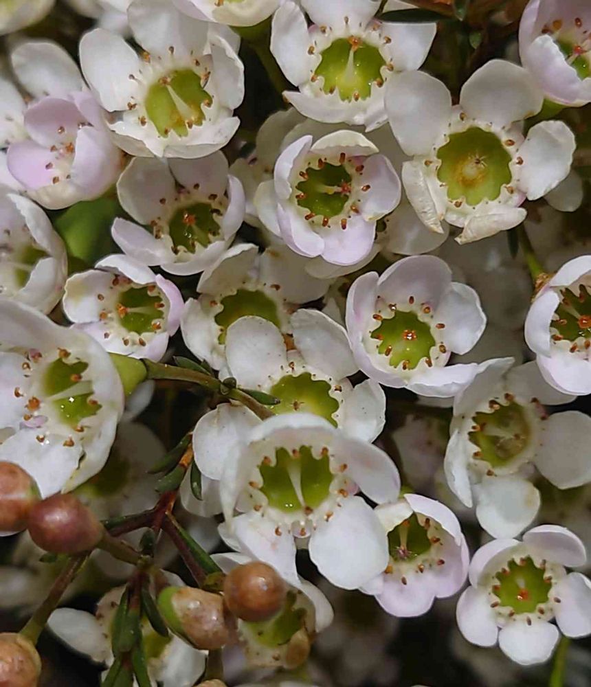 白いワックスフラワーの花、金粉がキラキラして綺麗です✨✨