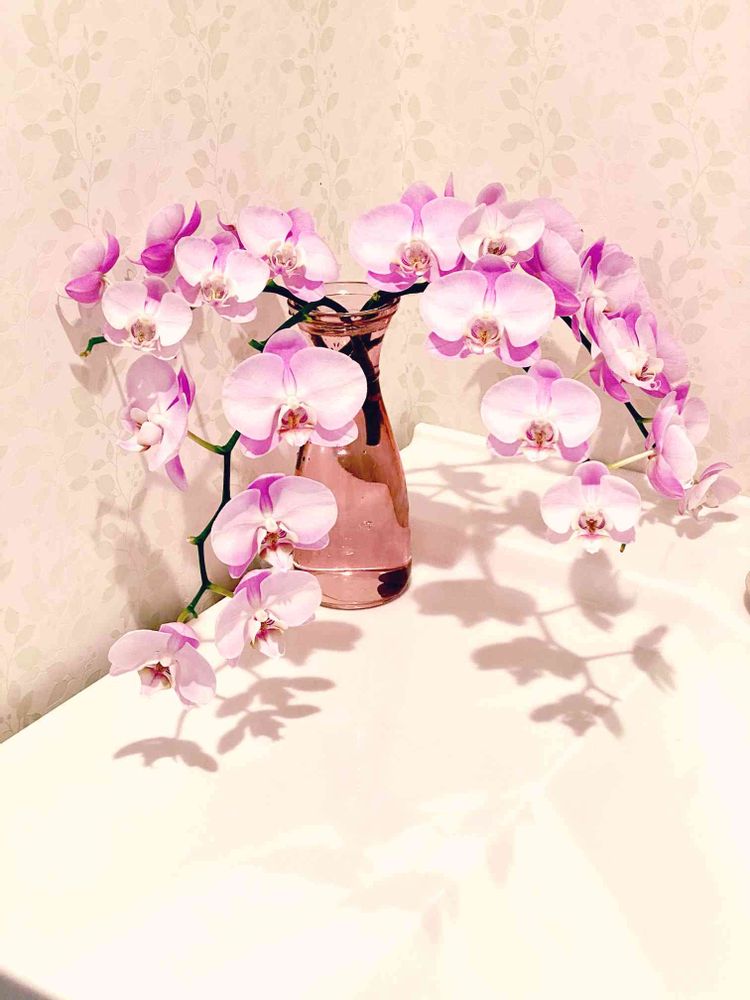 ピンクの優しい花瓶に、胡蝶蘭の影✨
