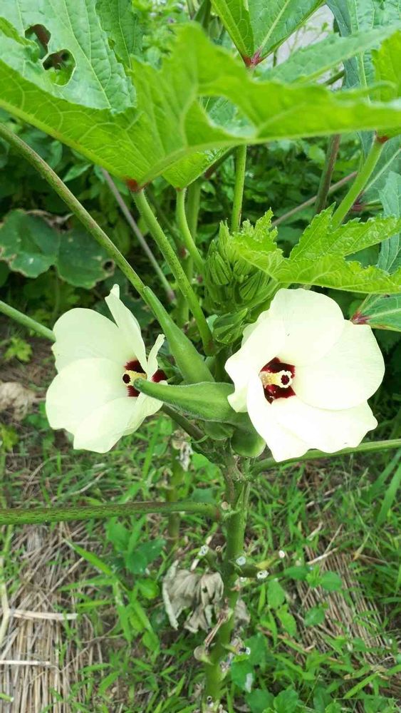 畑にオクラの収穫に行ったら😊殆ど一輪☀️花を付けていたけど🎵このオクラは2つ😆とっても綺麗でした👌