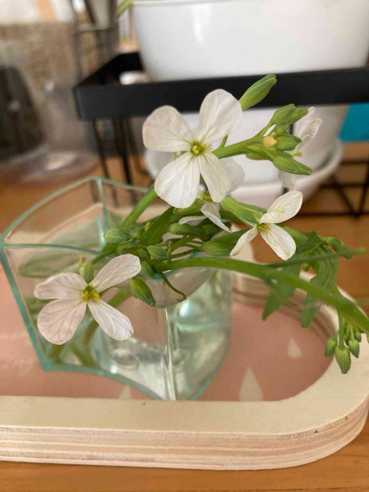 庭にある大根菜の花です。まだもう少し大根菜を楽しみたいので、お花摘みました🌸お花も堪能します(*´˘`*)♥