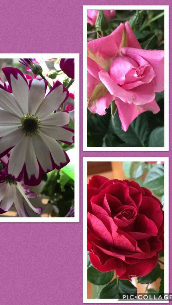 キッチンで咲いてるミニ薔薇さん2種とサイネリアさんです(╹◡╹)