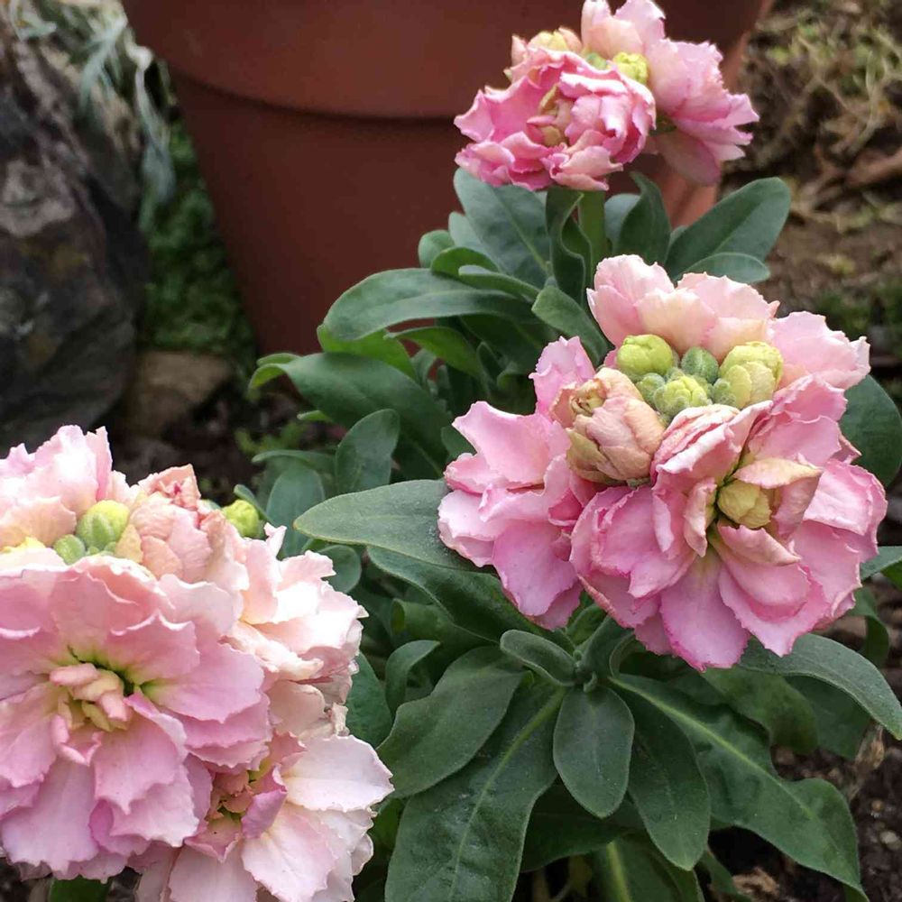 ハイジさんのマネをして、植えたときに恐るおそる切っておいたストック、枝分かれしてたくさんの花が咲き始めました🤗