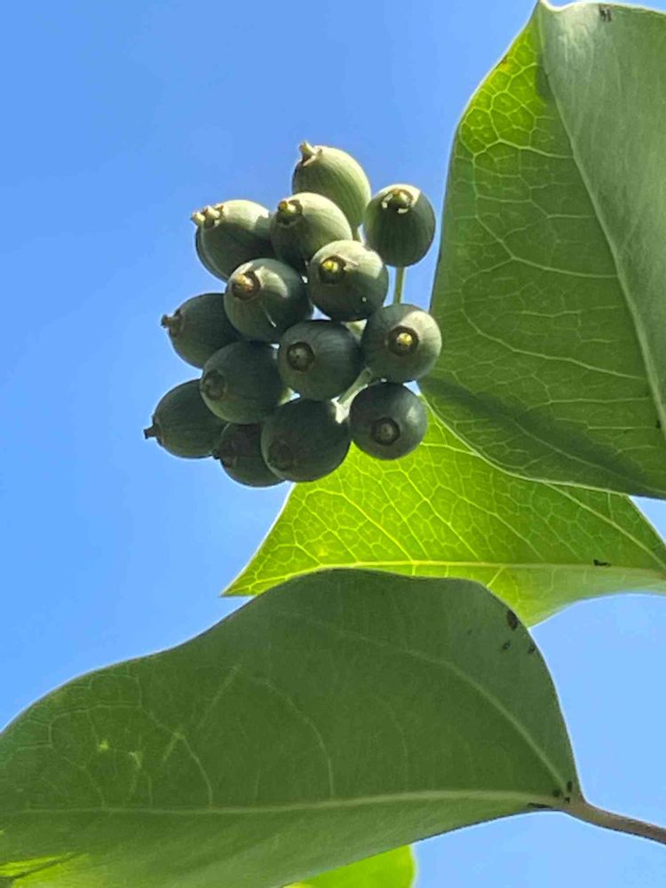 花の時期は、すでに終わって緑色の果実が、、晩秋には、黒紫色に熟すそうです