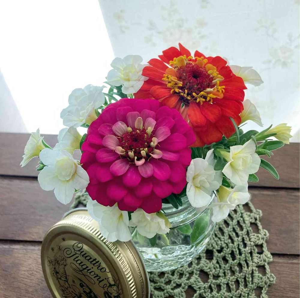 庭にごぼれだねで咲いたジニアと一緒に飾りました♫