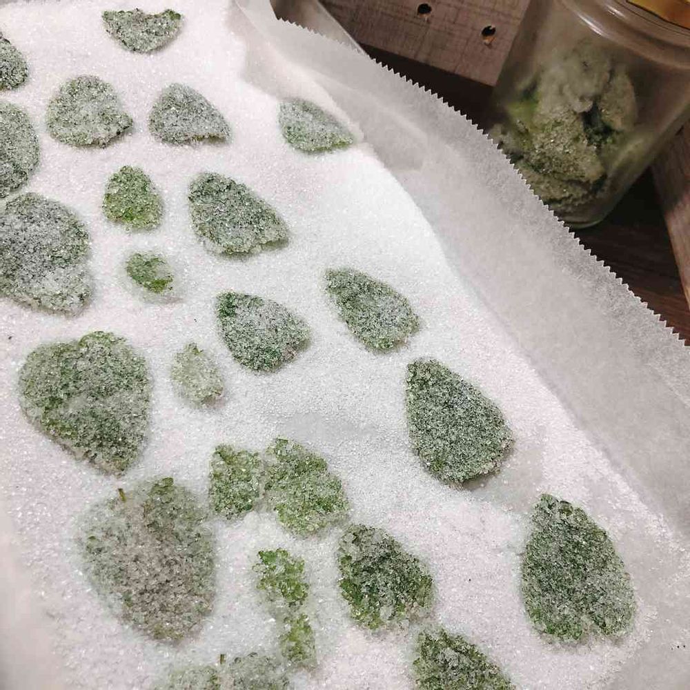 ペパーミントの砂糖漬けはしっかり固くなったので瓶に入れて冷蔵庫へ!