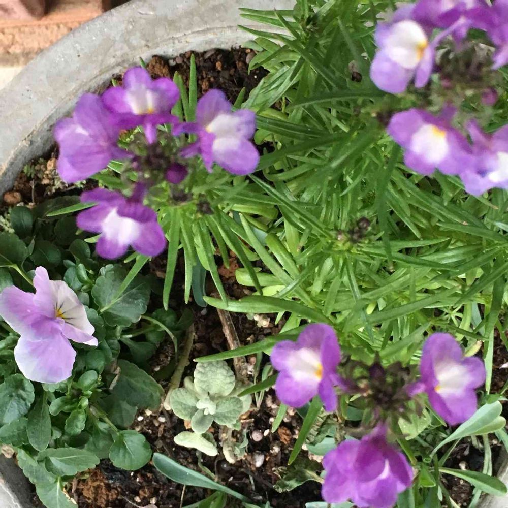 見切り品コーナーからお連れした子を使って、パープルな寄せ植えを作ってみました。