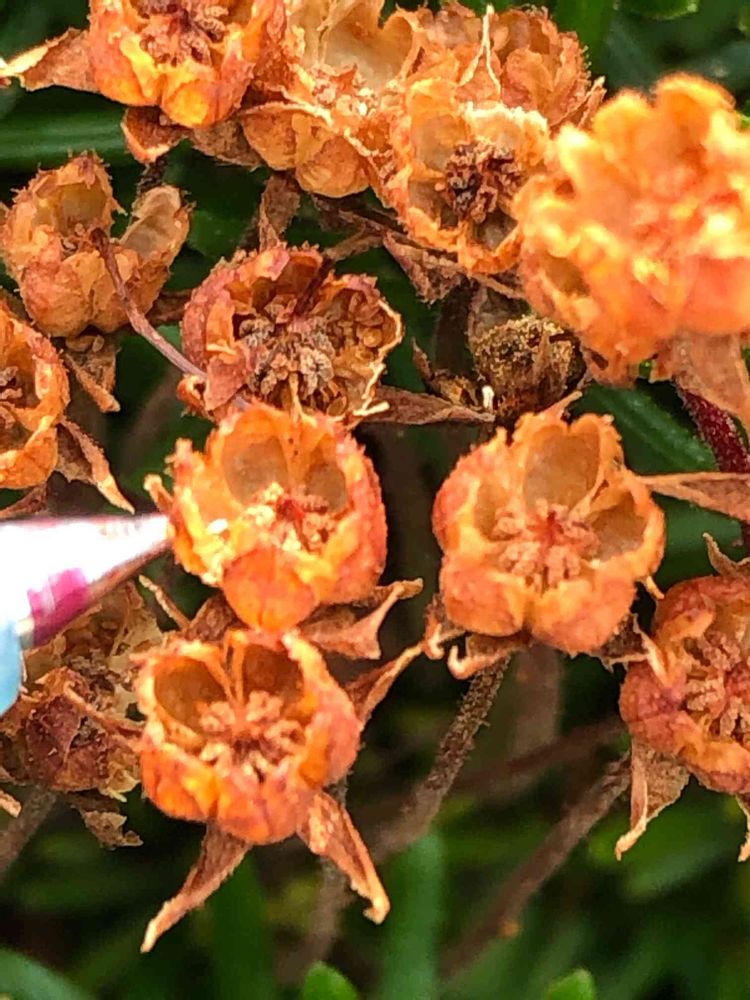 ロックガーデンに敷き詰められた、もう一つのみどりの絨毯からは、まるでキノコが群生するかの様に、たくさんオレンジ色の花序の痕跡が⁉️「エゾノツガザクラ」の花の後の様です‼️