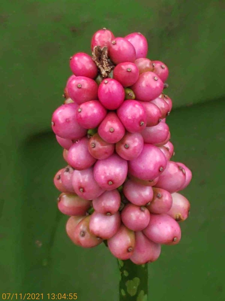 花?? 最初はスパティフィラムのようなのが出て 茎は蛇みたいですよ 緑色の実が出て…… ピンク~赤~紫色 と色が変わって行きます綺麗ですよ
