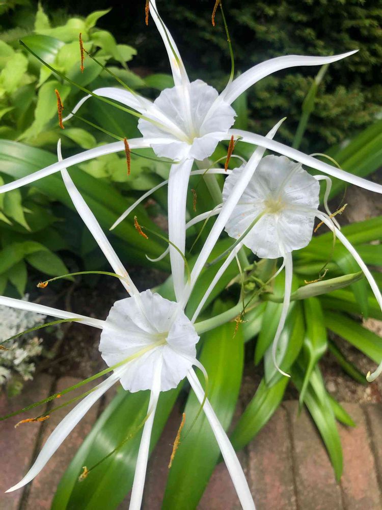 白い朝顔みたいなカップ状の花が蜘蛛の巣で、そこから蜘蛛の脚が出てるように見えるから『スパイダーリリー』と名付けられたそうですよ🤗