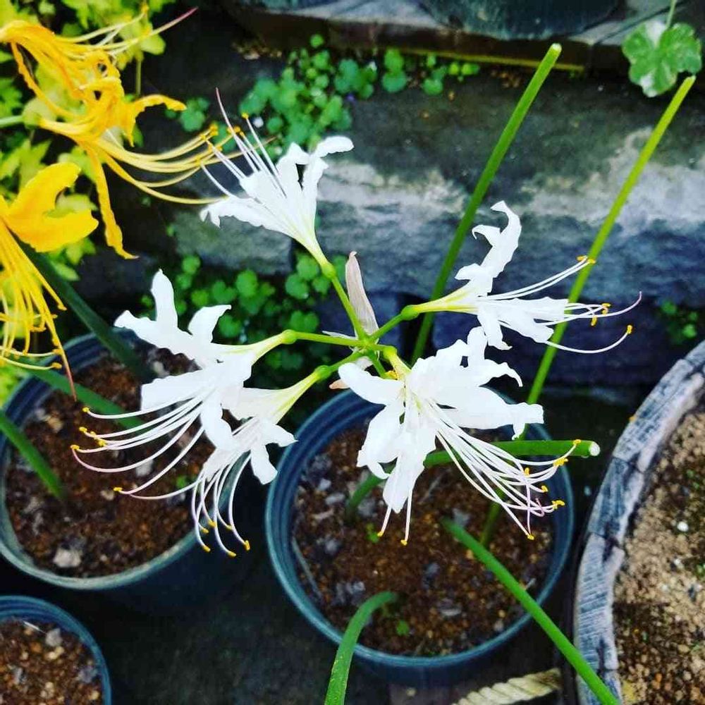 百合が原公園 温室の リコリス 。ヒガンバナ科ヒガンバナ属の総称。代表種が彼岸花(曼珠沙華)。園芸種が多彩。花弁が後ろに反り返るのが特徴。葉は花が終わってから出てくる。しべがくるんとして可愛らしい。種をつけないので球根で増える。東アジア原産。