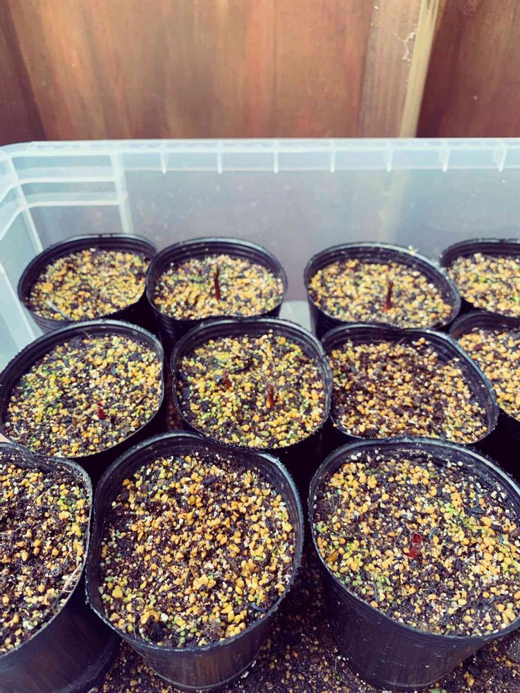 ネット情報では発芽率は低いという事で1〜2本発芽すれば良いと思い、果実を2キロ分購入して、20粒以上蒔いたが今のところ発芽率は80パーセントくらい。