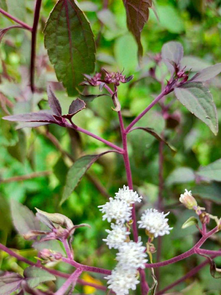 白花に紫の葉っぱが綺麗です。