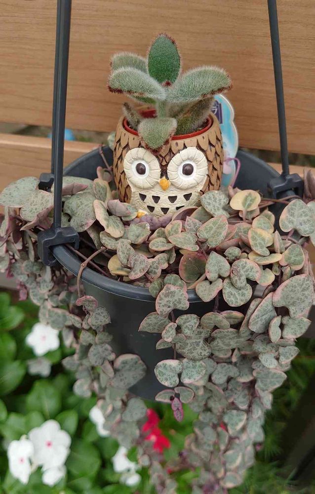 小さな庭で、フクロウ持ってウロウロ、パチパチ🤳✨変な人です🤣