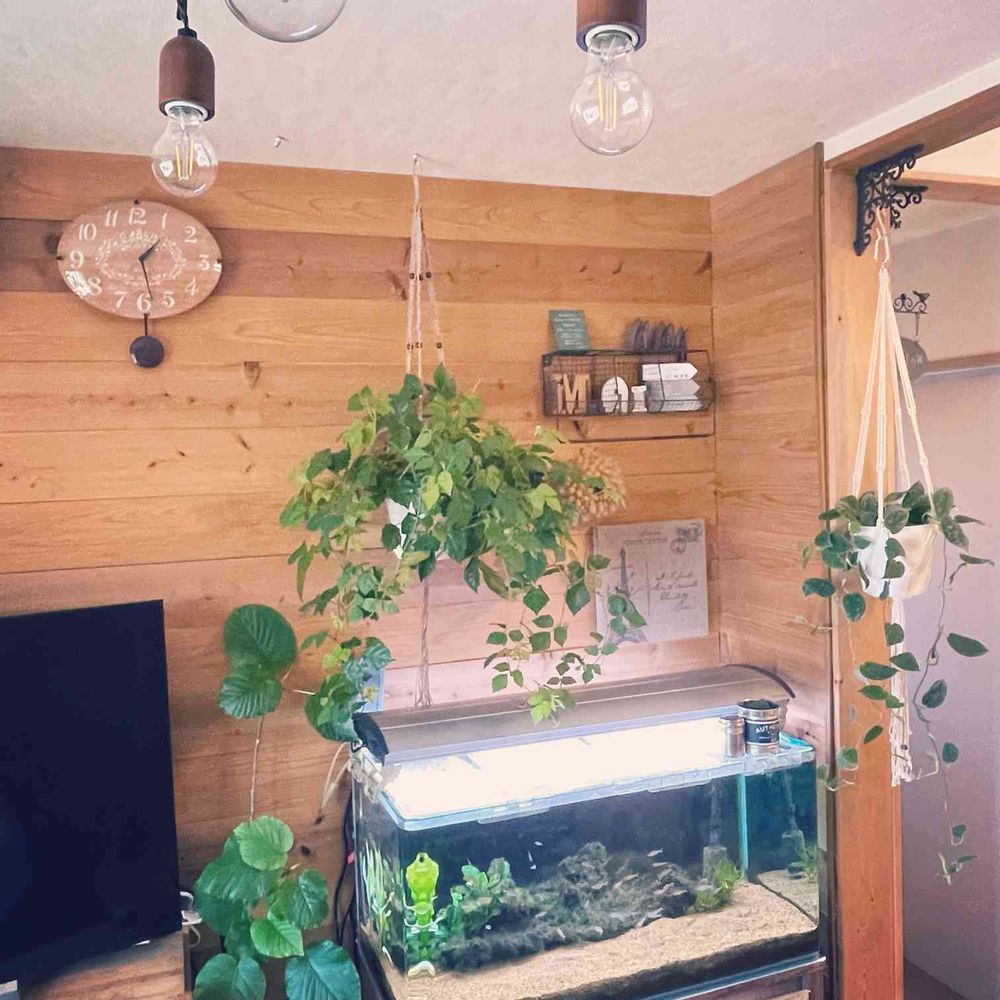 先日買ったグレープアイビー のボリュームが凄いです。45×90cmの大型水槽の上の空間をいぃ感じに覆ってくれて素敵です😍