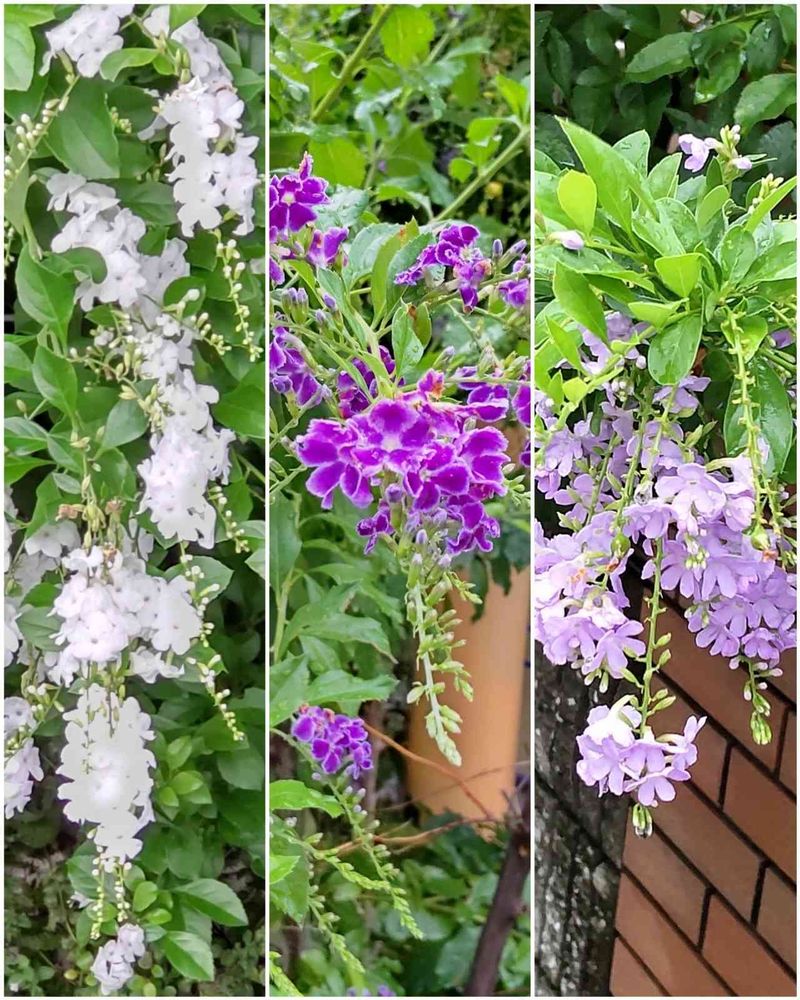 小さな花が集まって房状に垂れ下がって咲くデュランタは熱帯育ちで夏の太陽が大好きです。日当たりがいいと花数が増え 開花期間も長いです。