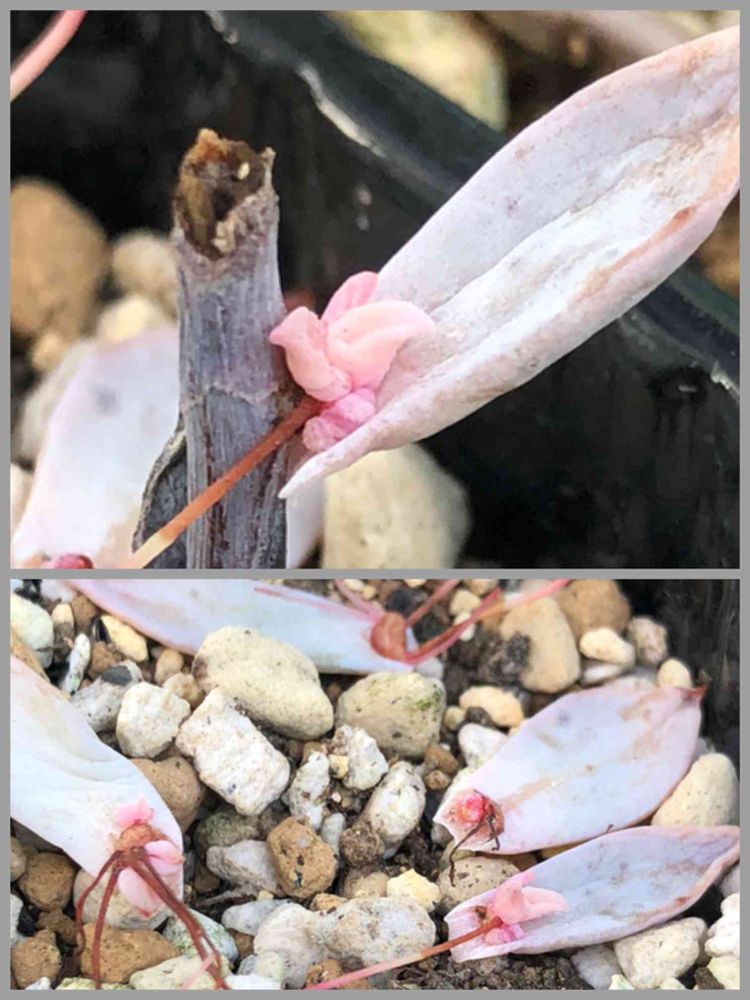 今年咲いた多肉の花芽を葉付きのまま挿し木しておいたら、茎は枯れたけど、葉刺しが育ってました🌱