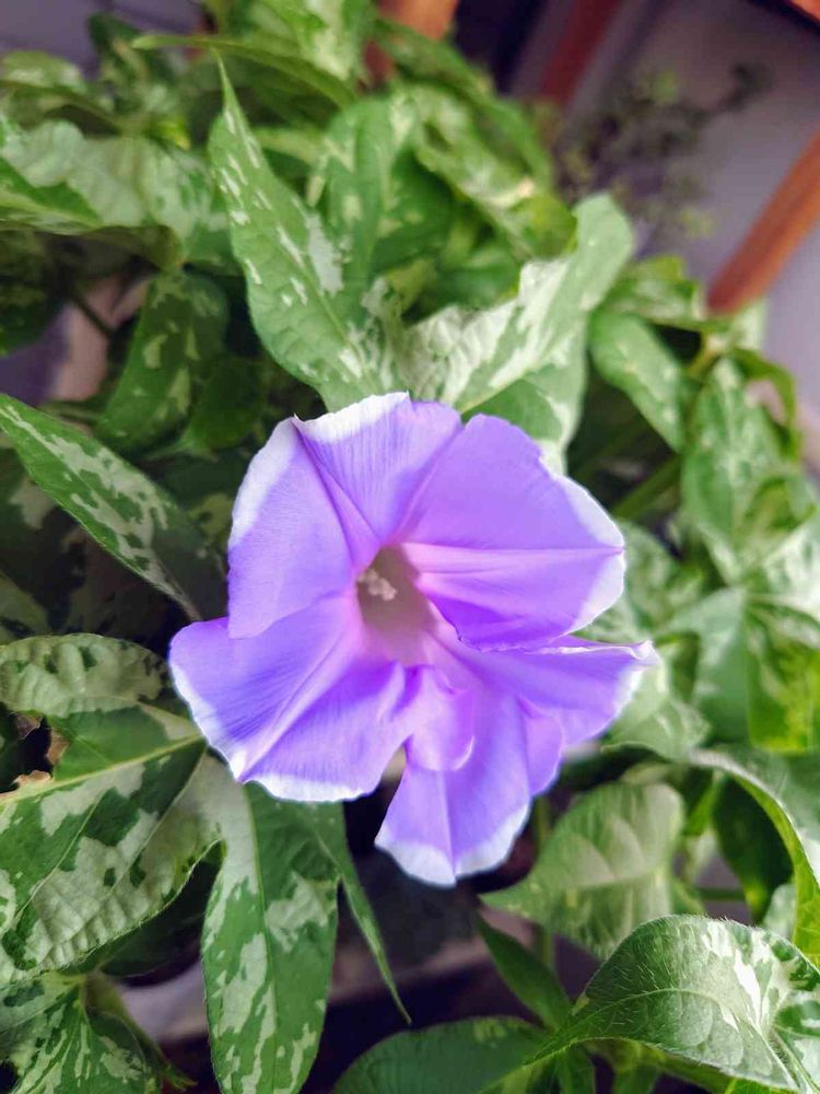 100均で買った種が、すくすくと育ってくれて、今朝初開花♡薄紫色のお花が咲きました〜🙌