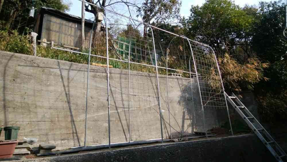 去年、ヒマワリを植えた場所にアルミ製キュウリ支柱を立ててフランソワジュランビル用のアーチを作りました。何故キュウリ支柱なのかというとこの場所の幅が狭く薔薇用のアーチのサイズが合わなかったのです。。。それでも憧れの薔薇トンネルを作りたかったのと予算的にアルミ製キュウリ支柱安い!ということで選びました。しかしフェンスはちゃんとした薔薇用のがベストだろうと別途購入し結束バンドで留めています。去年の春に購入した新苗のフランソワジュランビルは鉢いっぱいに根を巡らして期待感抜群。大きくなって殺風景なコンクリートを埋め尽くして欲しいです。