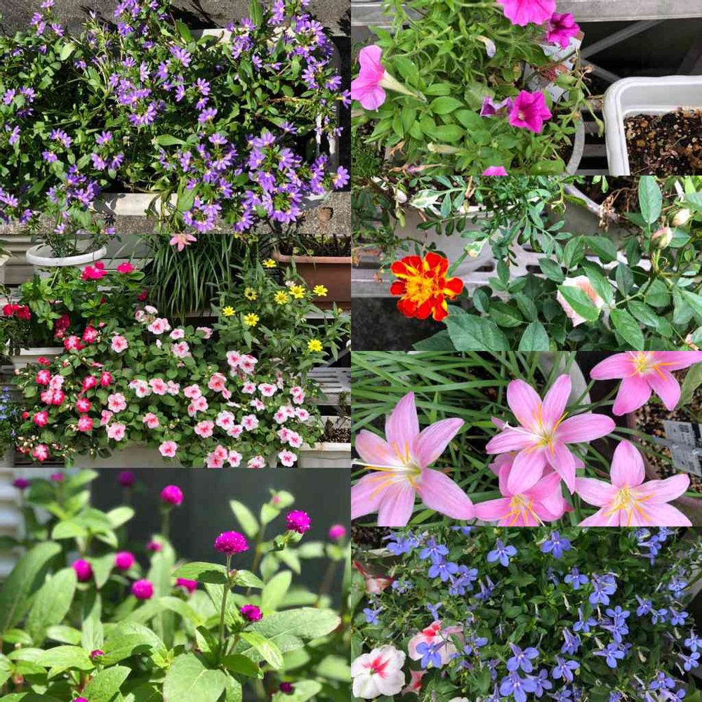 右上から時計回りでご紹介❗️ペチュニア、マリーゴールド、ゼフィランサス、ロベリア、千日紅、インパチェンス、スカエボラ(ブルーファンフラワー)他にも咲いてるんですが〜😅
