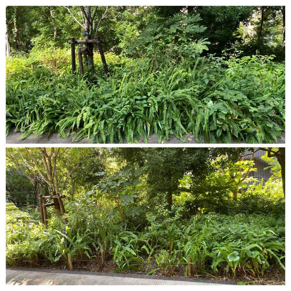 今日の仕事日記1...通路ぎわのタマシダ等の手入れ、、極力陽射しを避けて😉