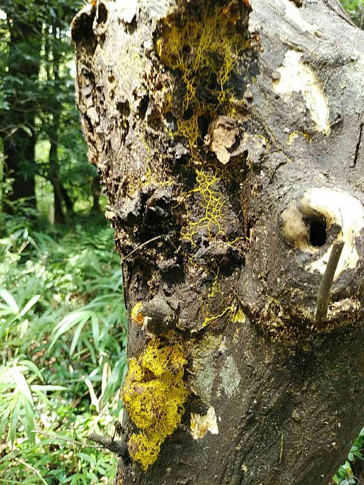 朽ちた木を見かけたら、わたしは、キノコ🍄を真っ先に探してしまいますが、この黄色い粘菌は、目につきますね~😄