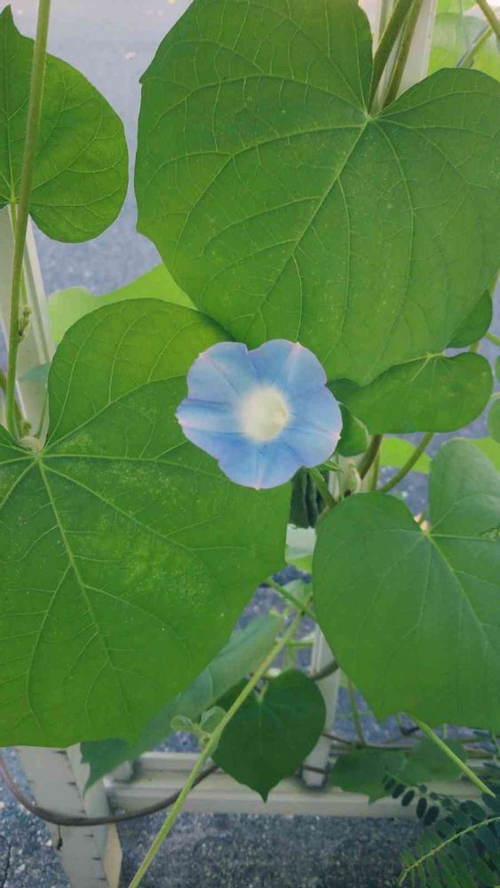マルバアメリカアサガオでしょうか? 車庫のフェンスに植えた覚えないアサガオあるなーと思ってたら 今朝咲きました