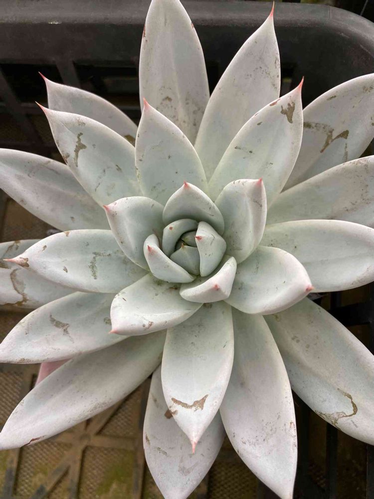 白い粉をまとい、やや細長い葉。葉先には、ほんのりとしたピンク色。