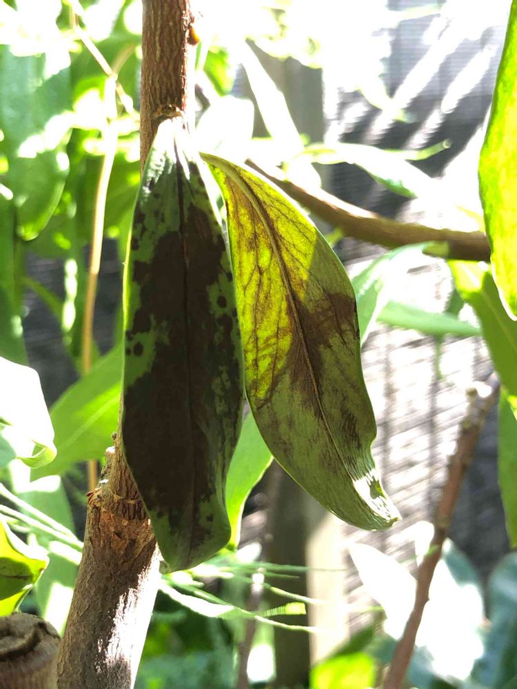 所々、こんな感じで葉が黒くなり、少しずつ枯れて落ちていってます…〈次の画像〉