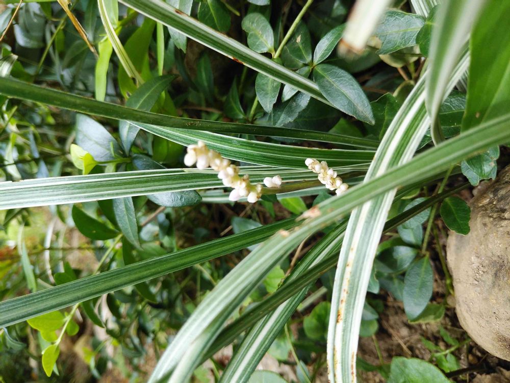 他に斑入りヤブラン、オオバジャノヒゲかナガバジャノヒゲ、キチジョウソウなどがあり、ノシランは枯らしているのでGGレンズで聞きましたらスイシヨウラン(スノードラコン)と😊