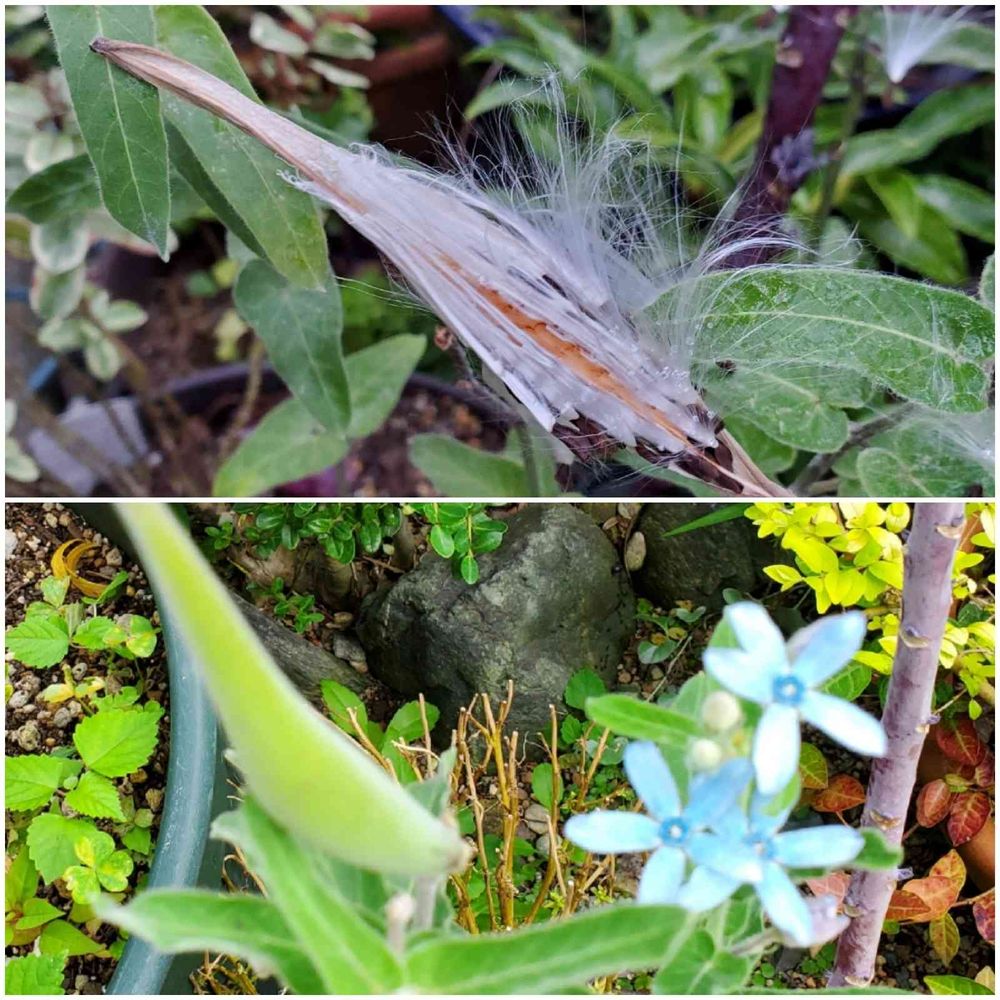 ブルースター種はじけました。白い大きな羽根です、かぜにのり遠くまで飛び出しそう。見ていたい気持ちを押さえて収穫しました。