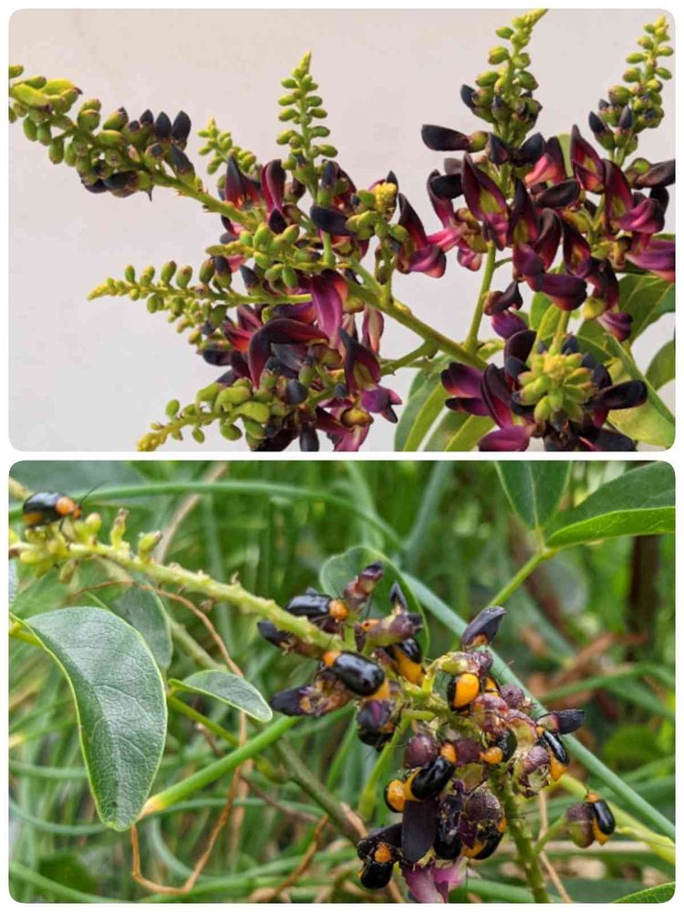 殺虫剤で死んでも 暫くするとまた次のウリハムシがよってたかってサッコウフジの花や葉を食べに来ます😭💦