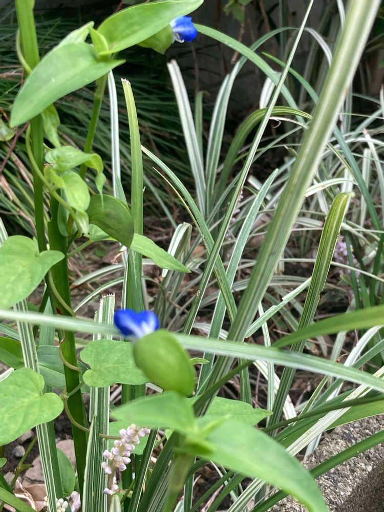 今日の花のツユクサとヒメヤブランの共生です😅。まだ、ヒメヤブランの花は小さいですね〜(>_<)。