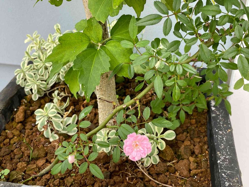ムクゲの鉢に挿した薔薇が咲きました◡̈❁