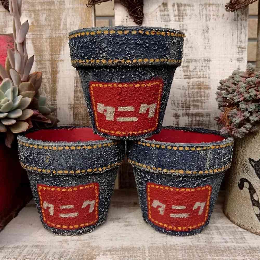 デニム風リメ鉢です💕革タグも付けたいけどどうやって付ければいいかな〜(*ºัỏºั)ฅ!?