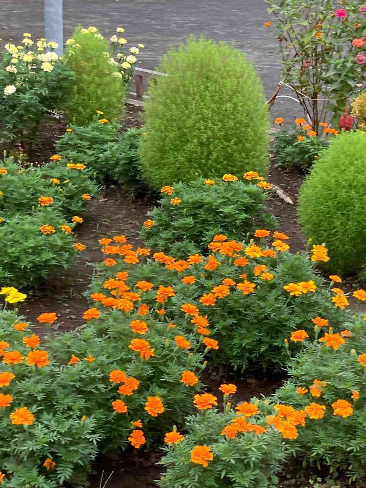 マリーゴールドとコキア、素敵な取り合わせで、色合いが綺麗ですね。元気を貰えますね🧡💚