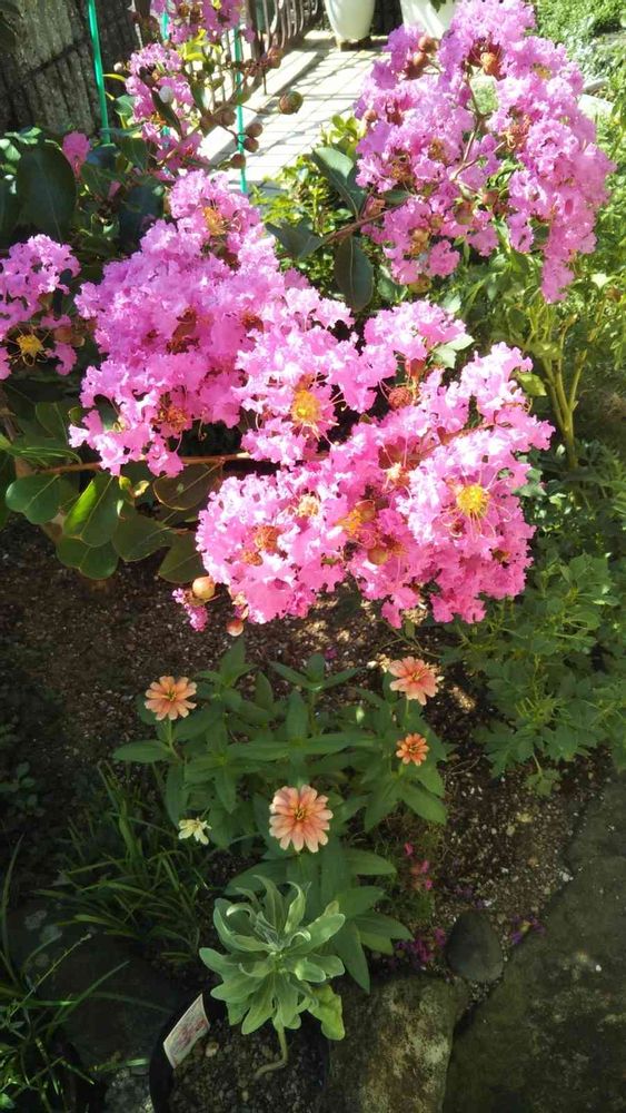 一才サルスベリ 百日紅です 4回目咲いてきました 下は ジニア 百日草です💕