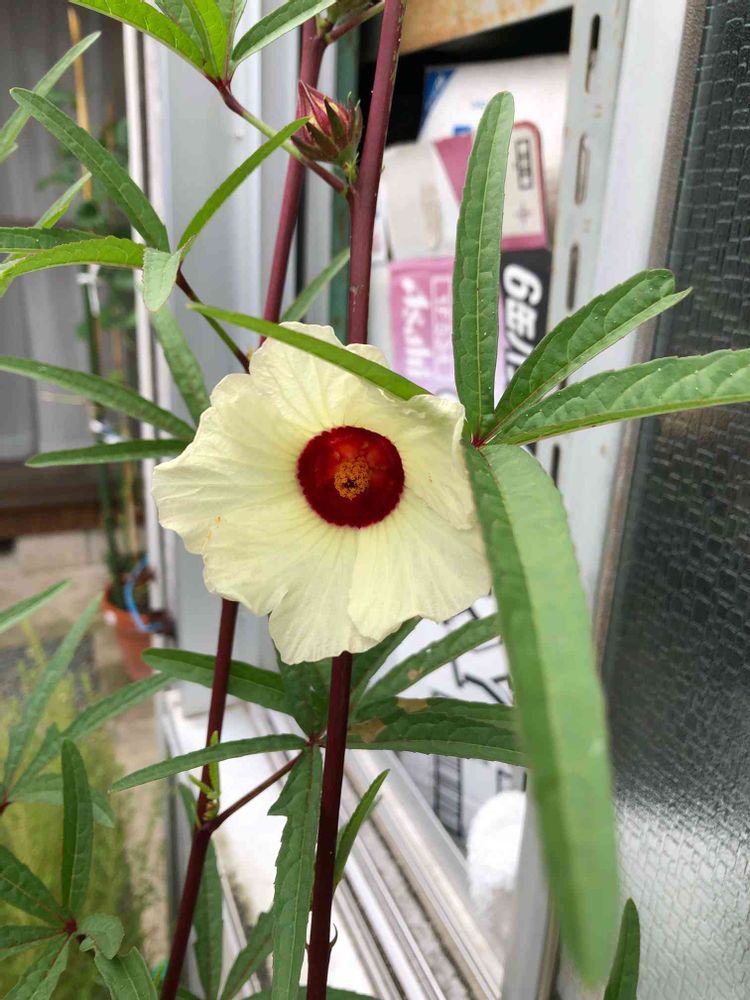 やっと ローゼルの花が咲きました。 赤色では無くて黄色でした