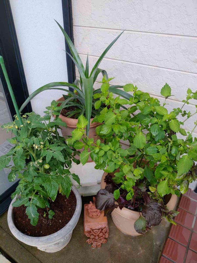 玄関にトマトとシソ😂😂😂
