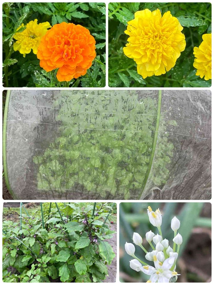 コンパニオンプランツのマリーゴールドとニラの花が咲いています🎶