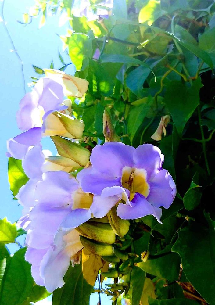 青空に映えるベンガルヤハズカズラ💜💜💜壁一面に咲いていますー!空気も綺麗にしてくれるお花💜深呼吸です(o^^o)