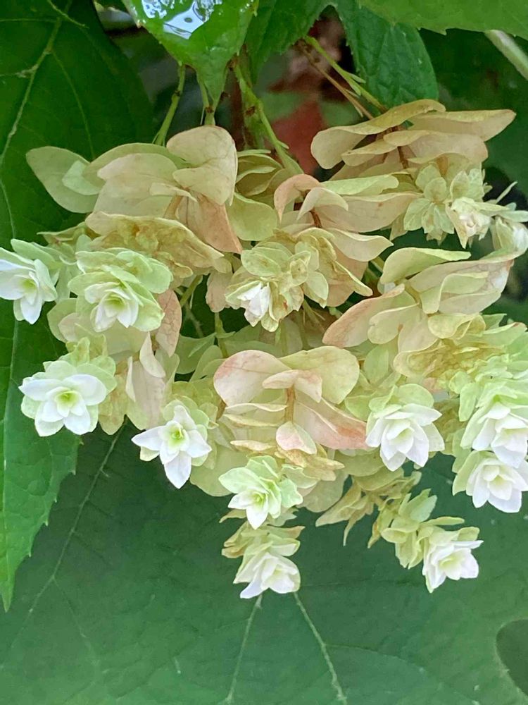 庭の葉の下に隠れてたカシワバアジサイの花です。少し小さ目だけど咲いてます。