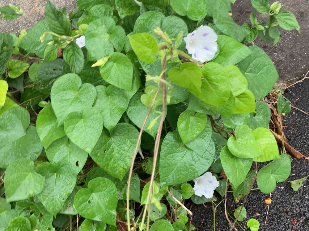 道端のアスファルトの隙間から生えて咲いています。花はアサガオよりかなり小さく直径5cm程、葉っぱはハート型です。